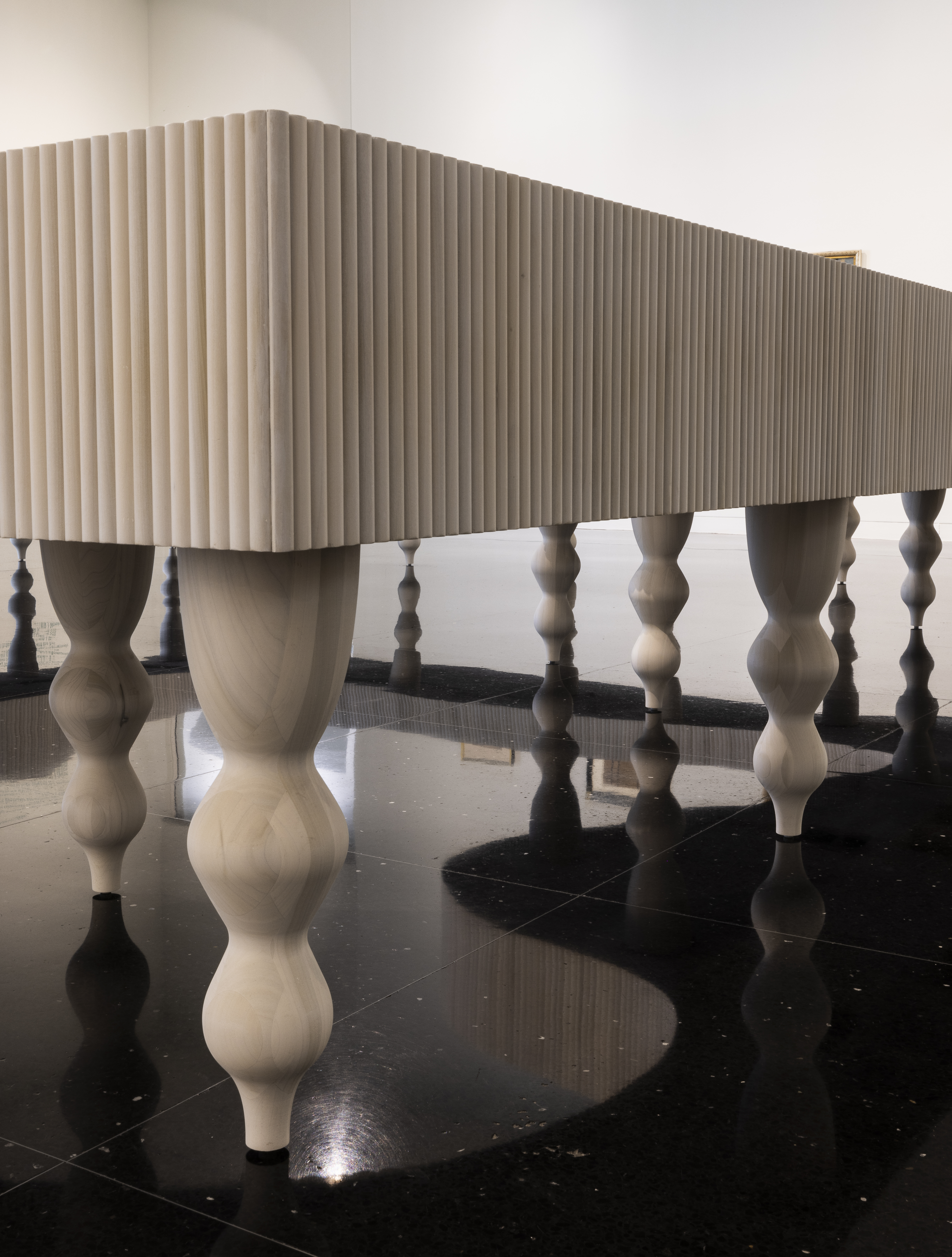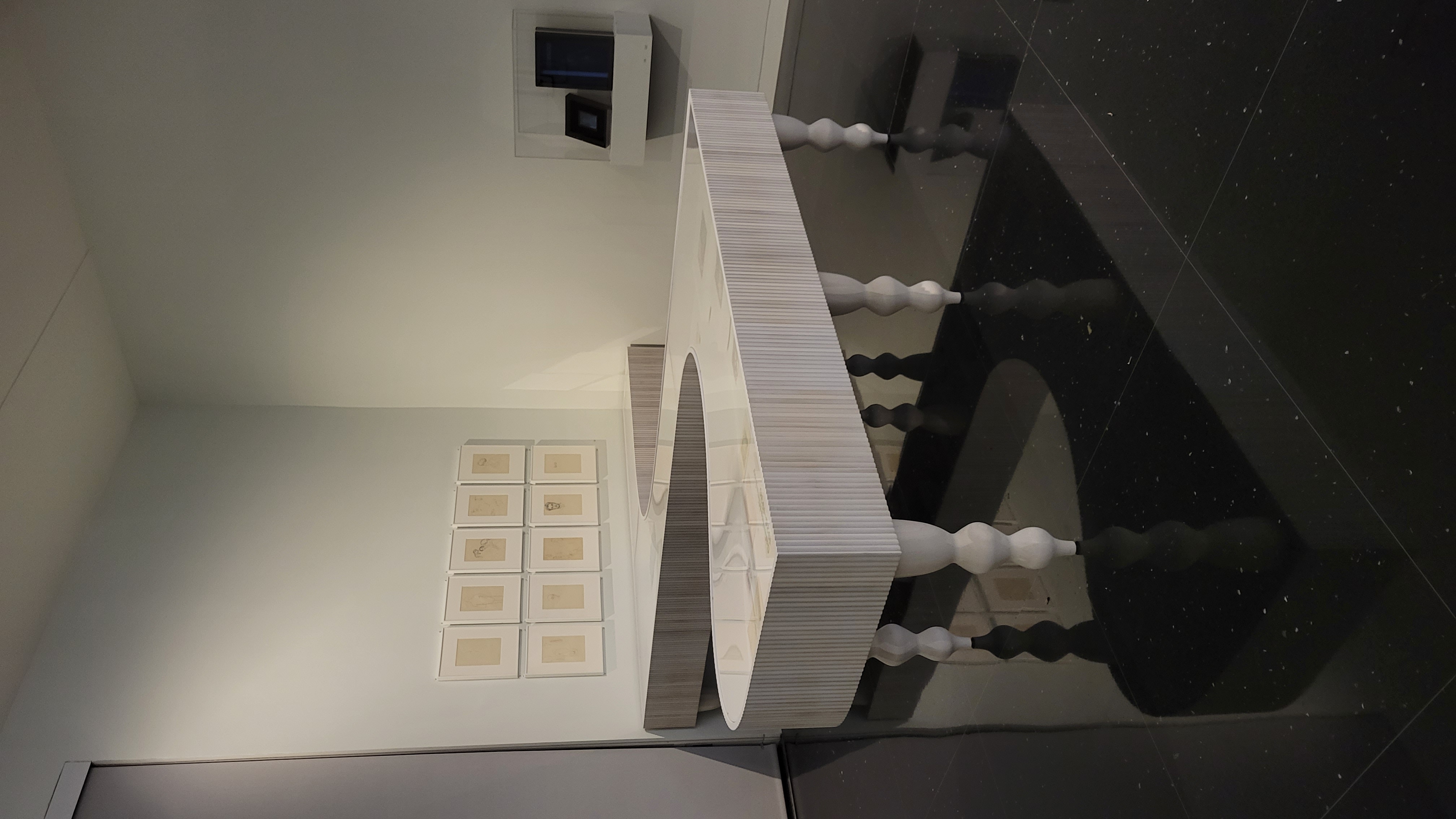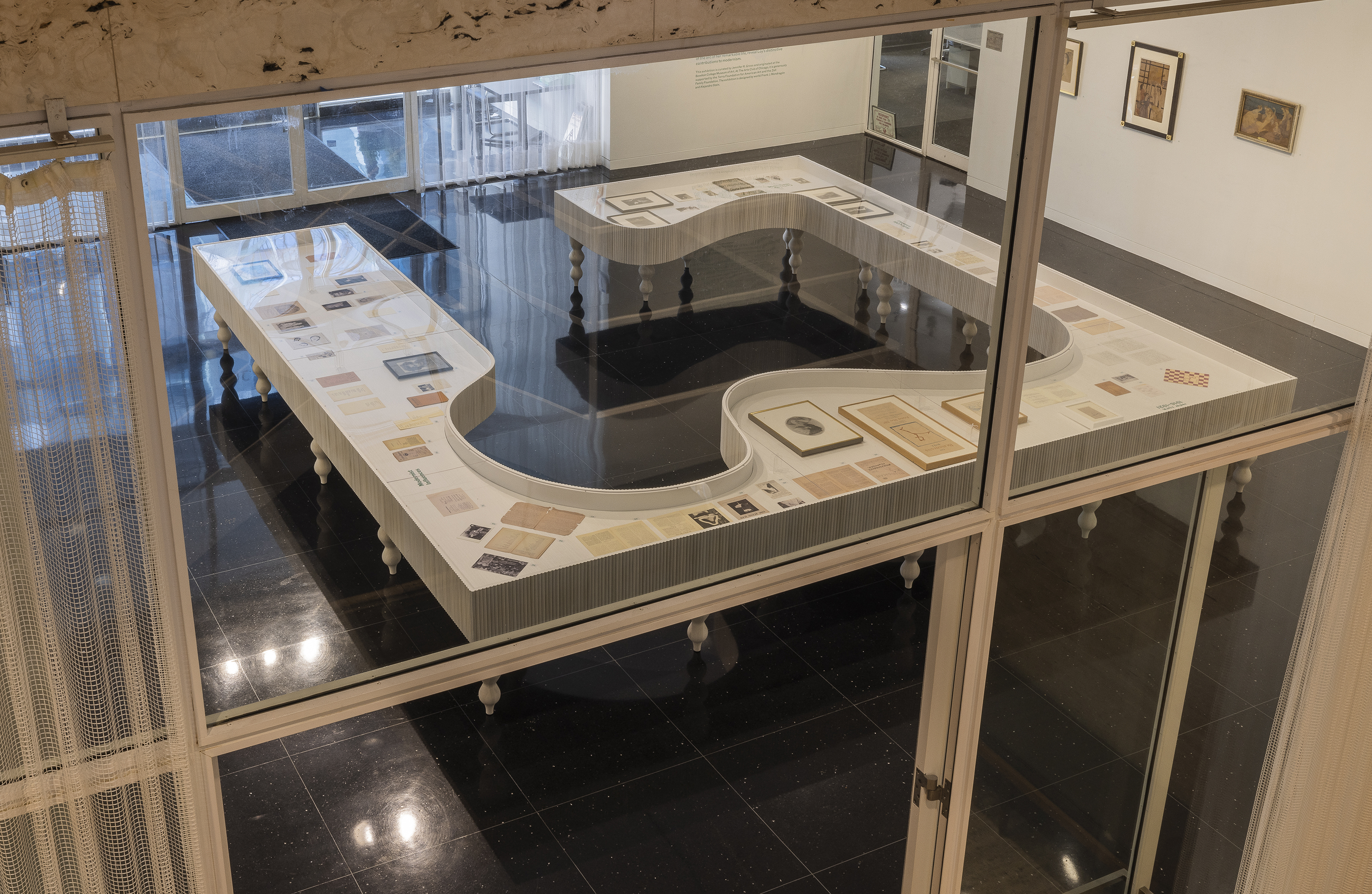 These biographical archives became the organizing principle for the exhibition. As such I designed a family of tables that served a dual purpose of displays and spatial devices. Drawing references from the artist's formal language, combined with 19th and early 20th century furniture design, the design for the tables strikes a note of oddly familiar.