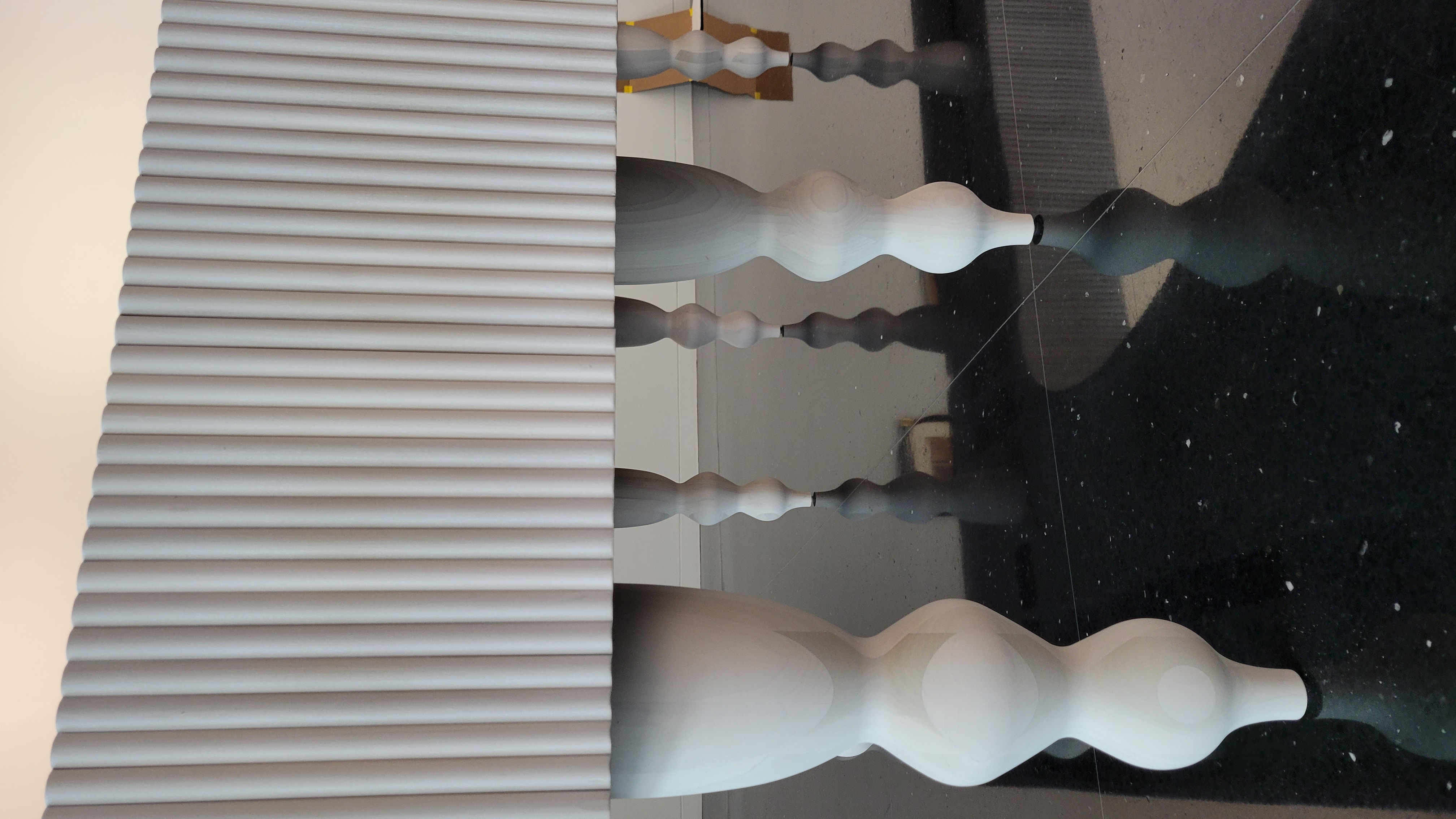 The legs of the tables are spun out of composite blocks of poplar, finished with a light white stain. The combination of the straight vertical layering of the material with the conically undulating profile of the legs generates a look and finish that give this centuries old technique a contemporary feel.